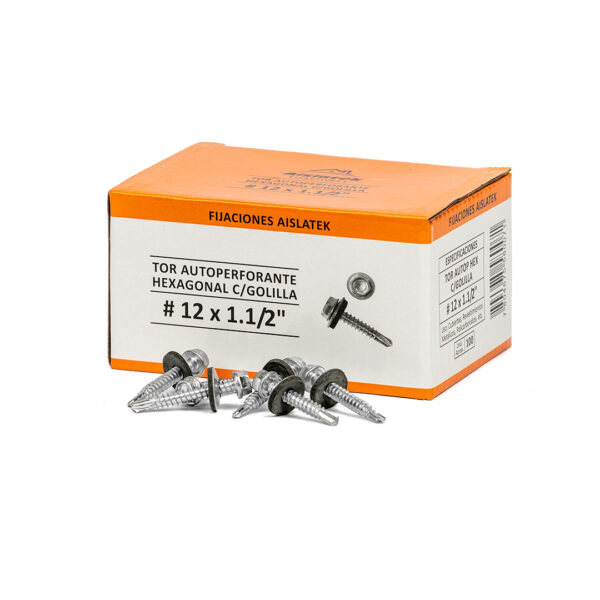 Tornillo autoperforante hexagonal con golilla de 1 1/2 pulgadas, ideal para fijaciones rápidas y seguras en metal y madera. Perfora y fija simultáneamente, reduciendo el tiempo de instalación.